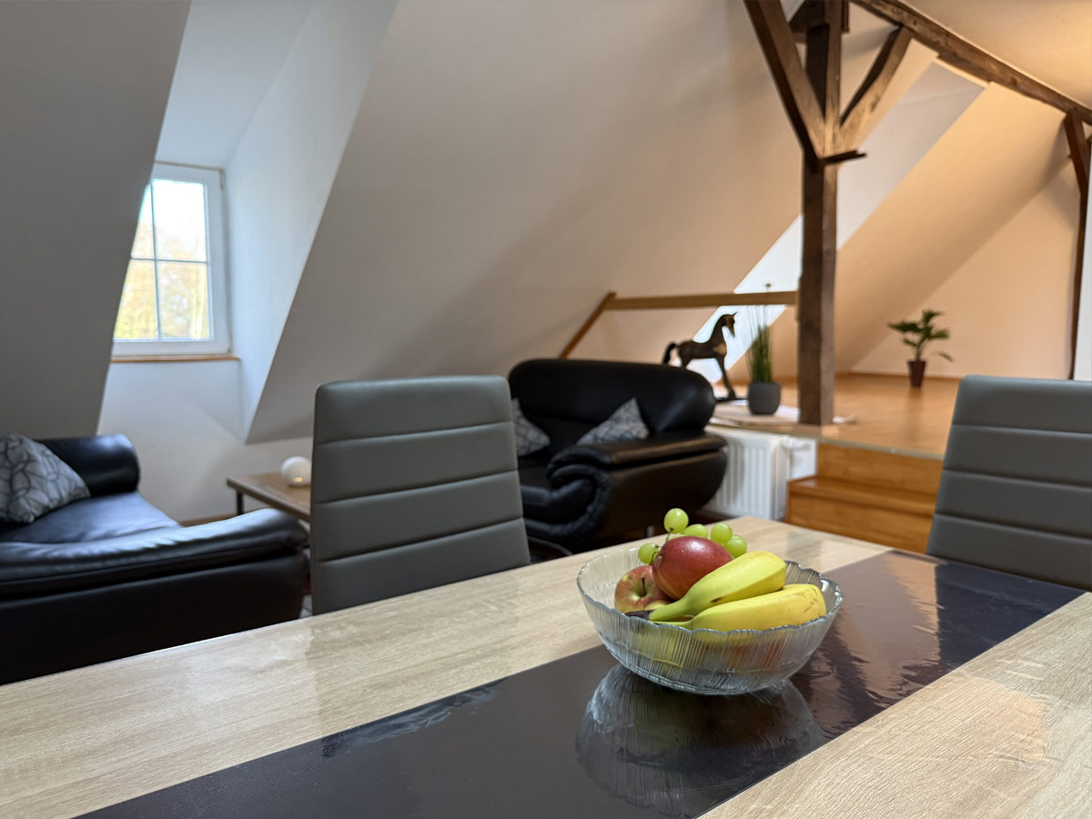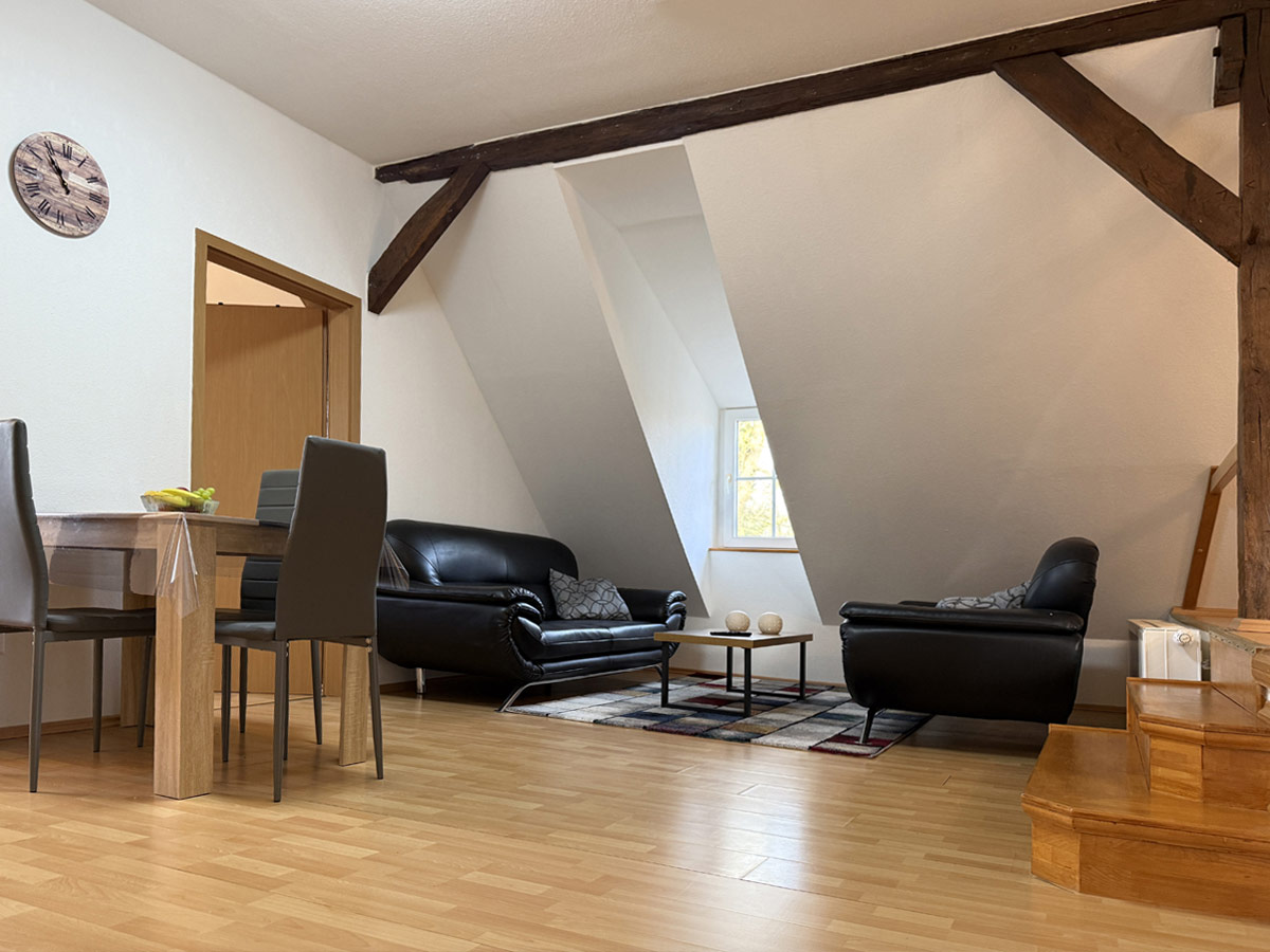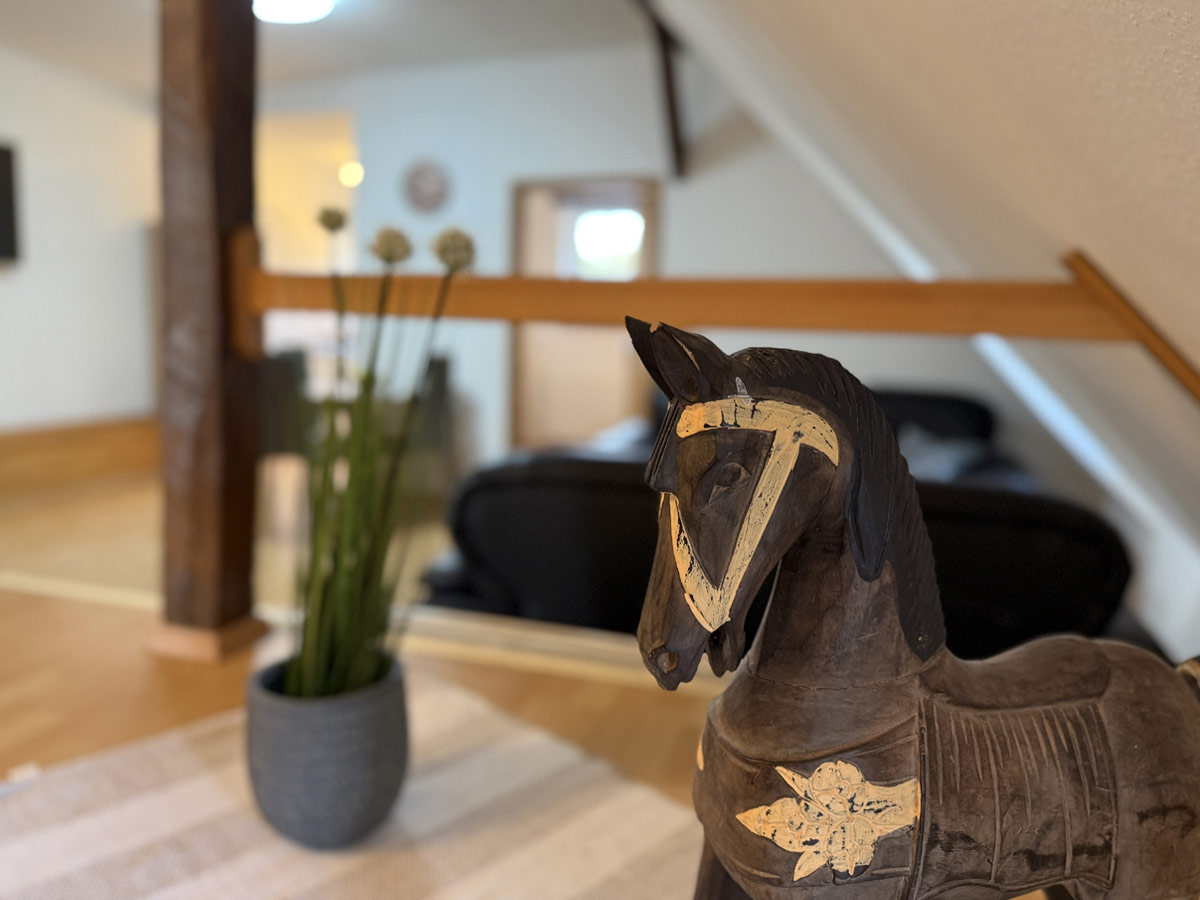 Unsere Ferienwohnung 3 bietet auf ca. 70 m² Platz für bis zu 3 Personen und besticht durch ihren ländlichen Charme mit stilvollen, alten Holzbalken und gemütlicher Atmosphäre.