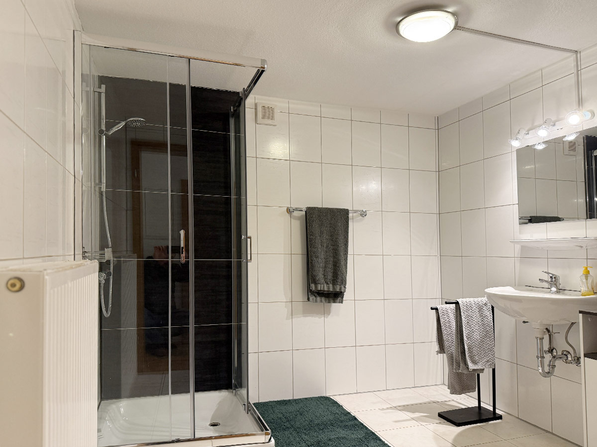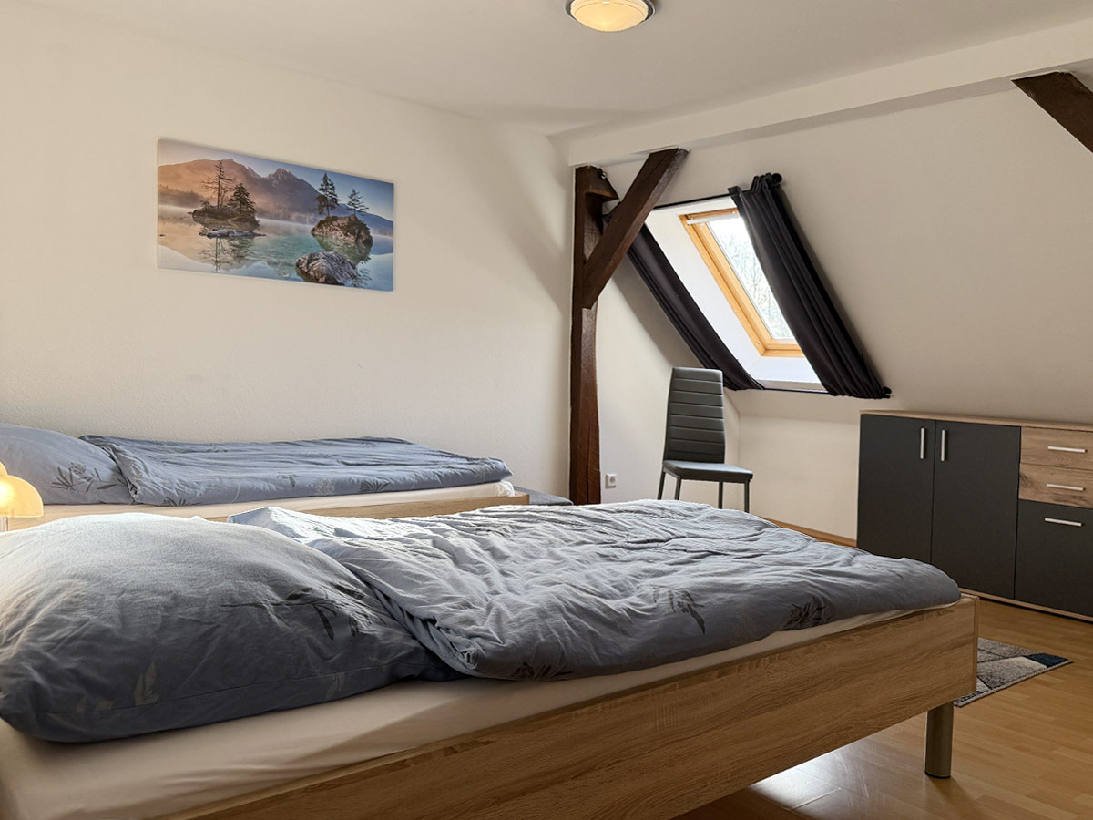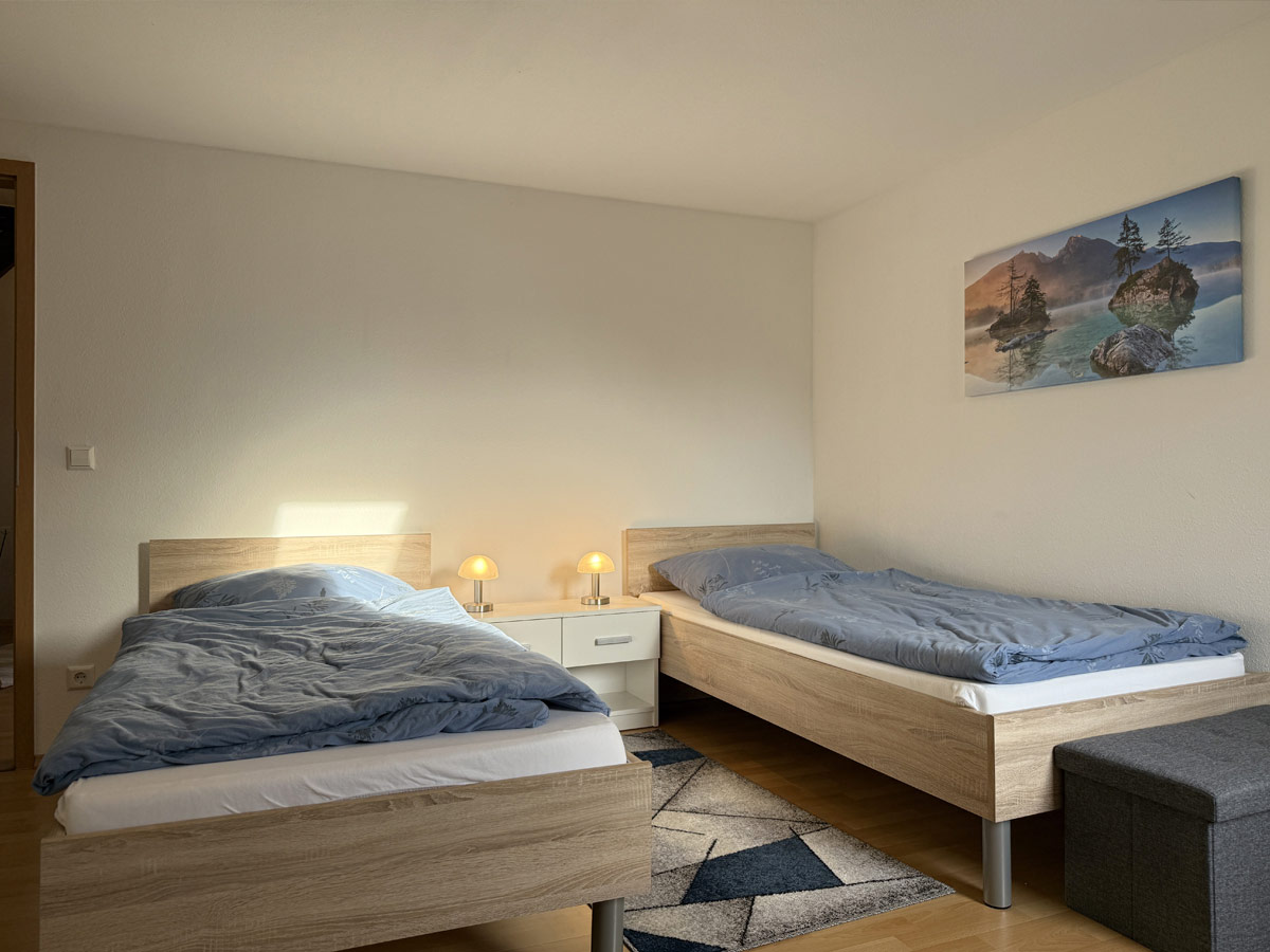 Die Wohnung befindet sich im 1. Obergeschoss und ist über eine Außentreppe erreichbar. Sie verfügt über ein Doppelzimmer mit getrennten Betten sowie ein Einzelzimmer, ideal für kleine Familien, Monteure oder Geschäftsreisende.