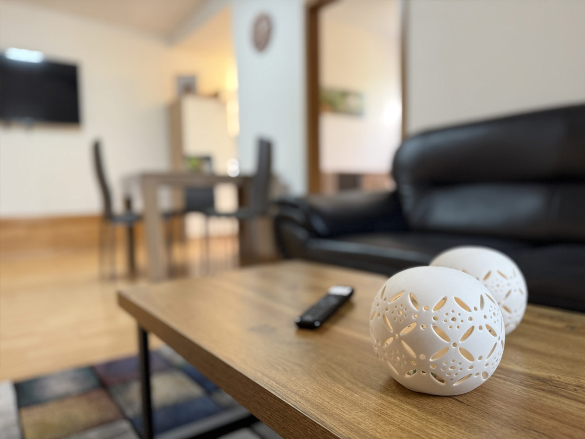 Der Wohnbereich ist modern und komfortabel eingerichtet und verfügt über einen Flat-TV mit YouTube, Netflix und weiteren Streamingdiensten sowie SAT-TV. HighSpeed-DSL-WLAN ist ebenfalls kostenfrei vorhanden.